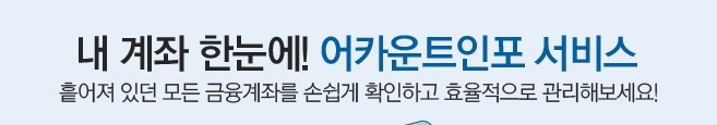 계좌정보통합관리서비스는 개인 금융 관리를 한층 더 편리하고 체계적으로 만들어줍니다. 모든 계좌를 한 곳에서 관리할 수 있는 이 서비스는, 효율적인 재정 관리를 원하는 모든 사람들에게 필수적인 도구입니다. 이제 더 이상 여러 은행을 오가며 복잡한 절차를 밟지 않아도 됩니다. 계좌정보통합관리서비스와 함께 더 나은 금융 생활을 시작하세요!