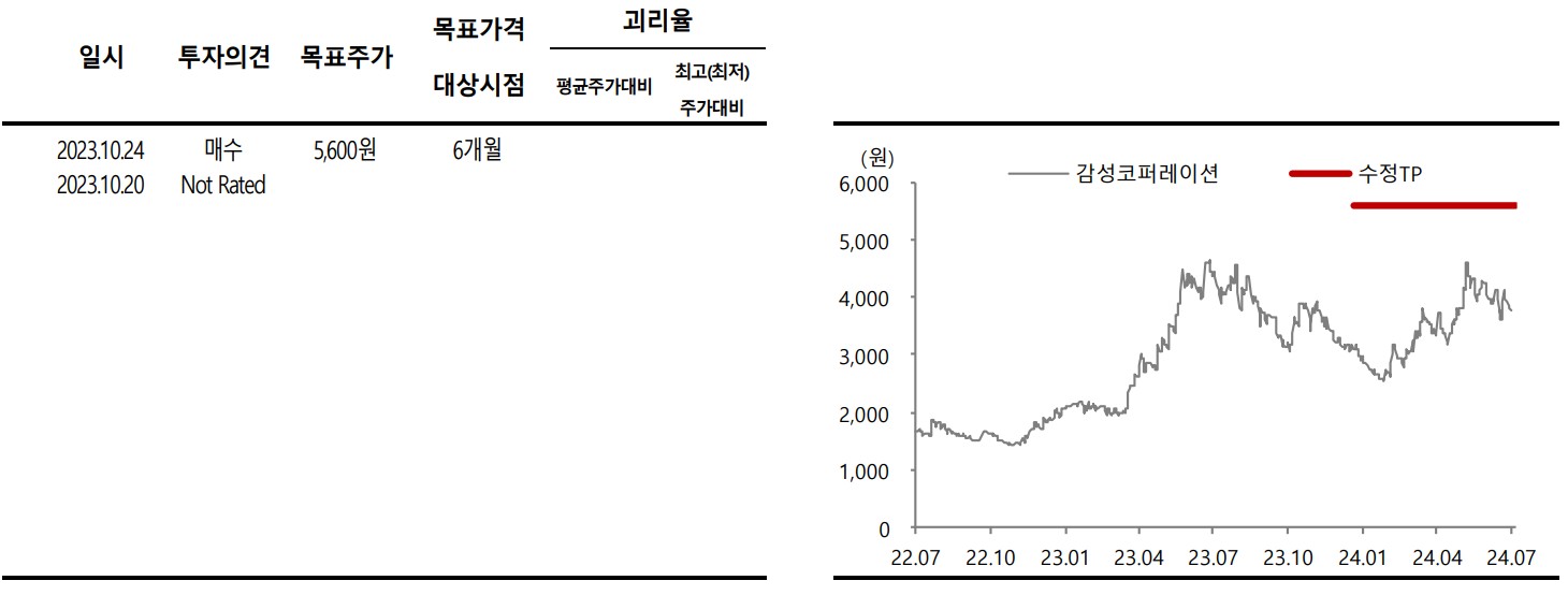 감성코퍼레이션의 목표주가는 5,600원으로 설정됨. 이는 현재 주가 대비 약 48.9% 이상의 상승 여력을 의미함. 해외 시장 진출과 국내외 브랜드 인지도 상승이 주가에 긍정적 영향을 미칠 것으로 예상됨.