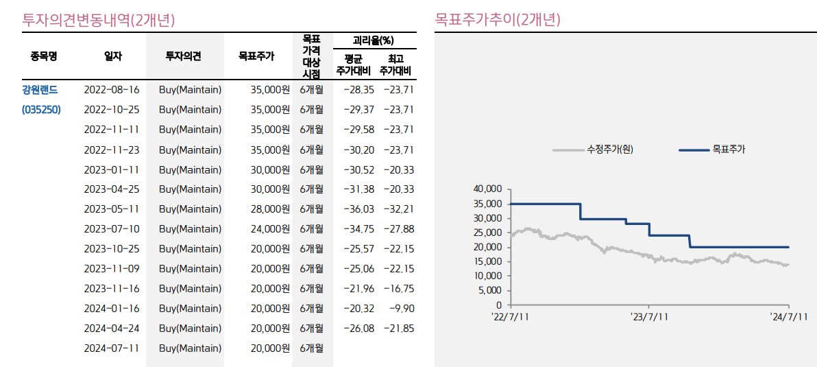 강원랜드의 최근 실적과 전망을 종합해보면, 하반기 성수기와 주요 연휴 시즌에 실적 개선이 기대됨. 카지노 VIP 고객 증가와 비카지노 부문 성장으로 인해 장기적인 주가 상승 가능성이 높음. 따라서 투자의견은 매수로 유지되며, 목표주가는 20,000원으로 제시됨