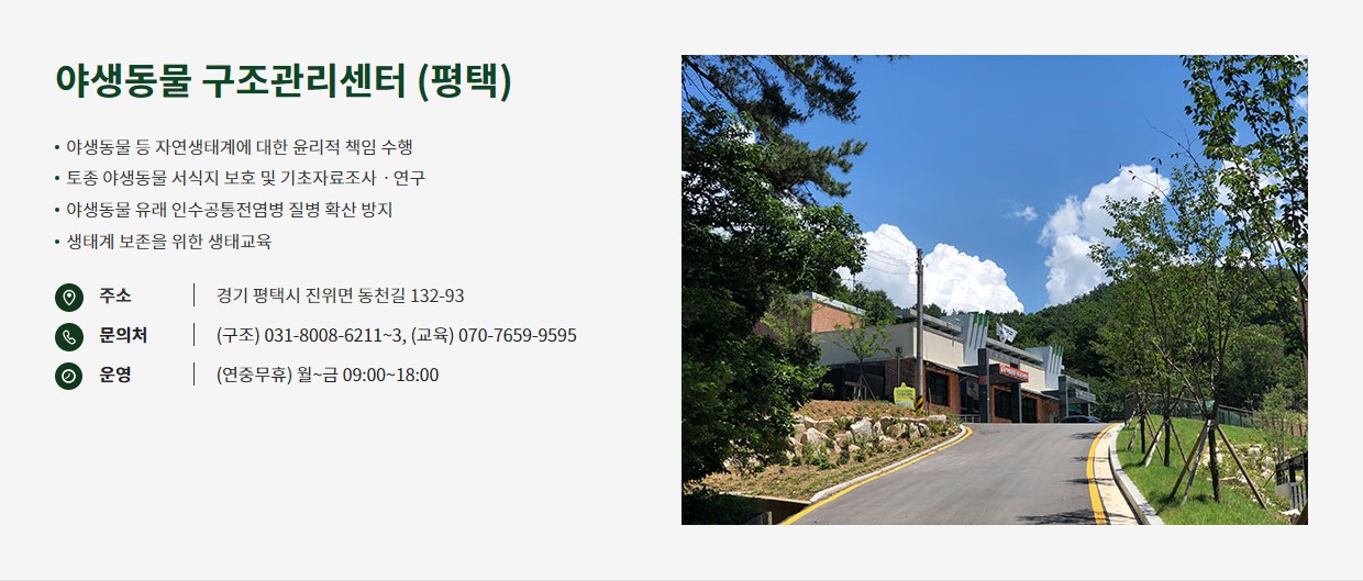 경기도 야생동물구조센터는 경기도 지역의 생태계 보호를 목표로 설립된 기관으로, 야생동물 구조, 치료, 재활, 그리고 자연 복귀까지 전 과정을 전문적으로 담당합니다. 이 센터는 지역 주민들이 발견한 다친 야생동물의 구조 요청을 처리하며, 동물들의 빠른 회복을 위해 전문 의료진이 체계적인 치료를 제공합니다. 자연 복귀를 위한 다양한 재활 프로그램도 운영하며, 센터는 지속적으로 야생동물 보호를 위한 연구와 교육도 함께 진행하고 있습니다.