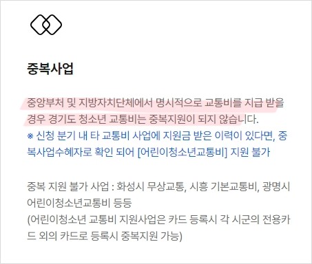 ✅ 주의할 점은! 중복사업에서 지원받을 경우 경기도 청소년 교통비 중복지원이 안 된다는 거에요! 어디선가 내가 교통비 관련해서 지원을 받고 있다면 경기도 어린이청소년 교통비 지원은 받을 수 없습니다!