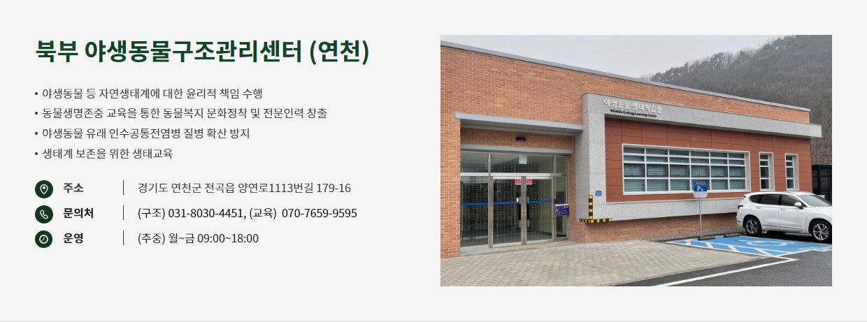 경기북부야생동물구조센터는 경기도 북부 지역의 야생동물을 보호하고, 부상당한 동물의 치료와 재활을 담당하는 전문 기관입니다. 이곳은 다양한 야생동물들이 자연으로 돌아갈 수 있도록 돕기 위해 설립되었으며, 신속한 구조와 체계적인 치료를 제공합니다. 경기도 북부에서 야생동물을 구조한 분들은 반드시 경기북부야생동물구조센터에 신고해주세요. 동물을 사랑하면 좋겠어요. 동물들은 죄가 없어요 ㅠㅠ 모두 인간이 나빠.
