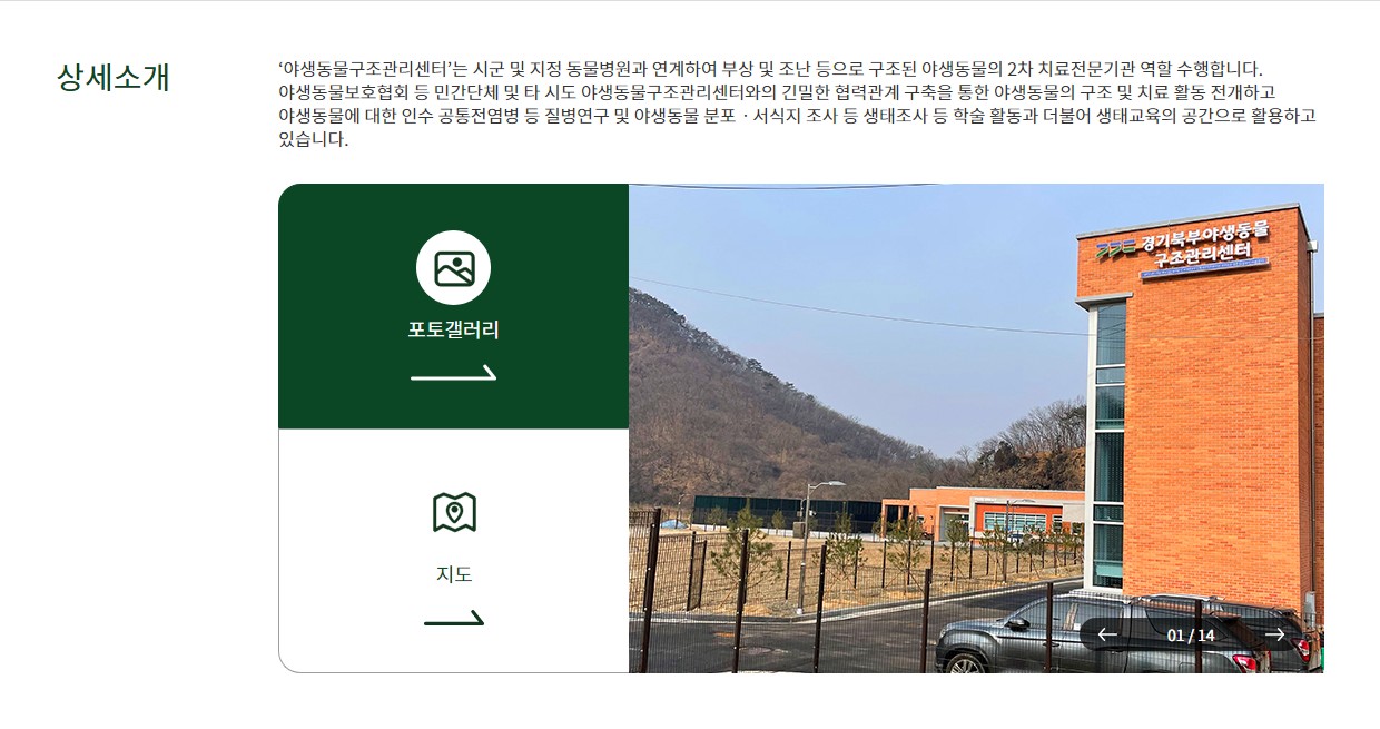 경기북부야생동물구조센터는 야생동물 구조부터 재활 및 자연 복귀까지의 전 과정을 전문적으로 운영합니다. 신속한 구조 서비스는 물론, 야생동물 개체에 맞춘 치료 및 재활 프로그램을 통해 동물들이 다시 자연으로 돌아가도록 돕고 있습니다. 주요 기능은 다음과 같습니다: