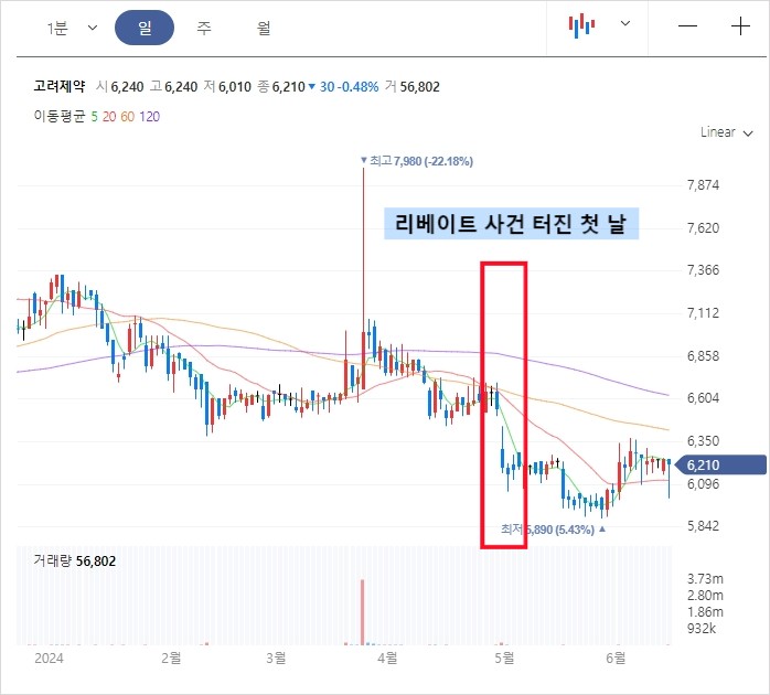 사실 리베이트 사건으로 인한 고려제약 본사 압수수색은 2024년 4월 29일 일어났었는데, 이 때 주가가 큰 폭으로 하락한 뒤 추가 기사나 수사결과가 나오지 않아서 주가는 다시 횡보중이었음. 이번 뉴스로 인해 내일 하한가를 갈 수도 있겠다는 생각..?