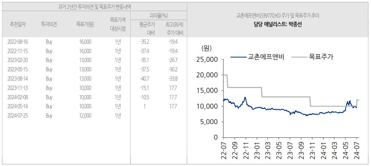 교촌에프앤비의 목표주가는 12,000원으로 설정되었음. 이는 현재 주가 대비 24.1% 상승 여력을 가진 목표치임. 회사의 가맹점 직영화가 완료되면 비용 절감 효과와 매출 증가가 기대되며, 이는 주가 상승의 주요 동력이 될 것임.
