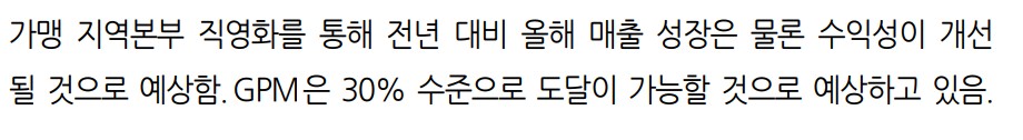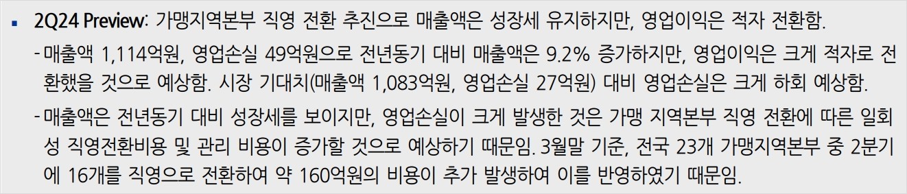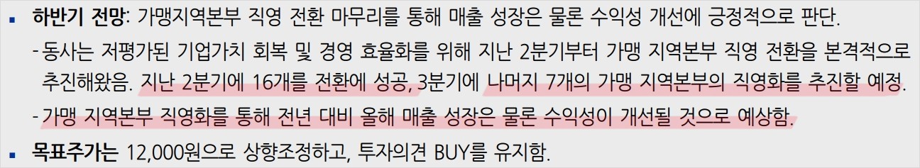 • 하반기에는 매출 성장이 예상되며, 가맹 지역본부의 직영화로 인한 비용 절감이 기대됨.