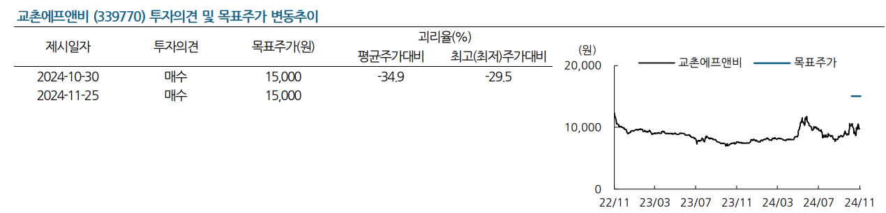 교촌에프앤비의 목표주가는 15,000원으로 유지됨. 이는 국내 시장 내 브랜드 경쟁력 강화와 해외 시장에서의 성장 잠재력을 반영한 수치임. 미국 가맹사업 확대와 아시아 시장 점유율 증가가 목표주가 달성의 주요 동력으로 평가됨. 단기적 이익률 개선과 장기적 글로벌 확장 계획이 목표주가 달성 가능성을 높이고 있음.