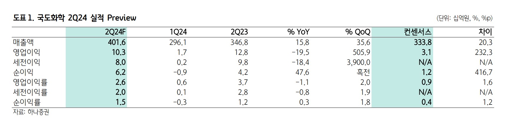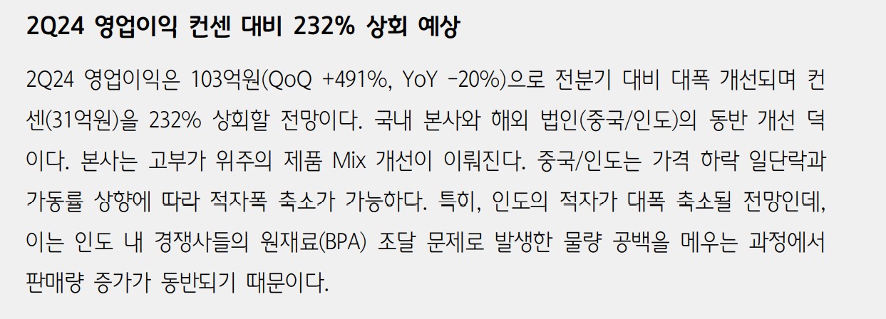 국도화학, 2분기 영업이익 103억원으로 컨센서스 232% 상회 예상. 국내 본사와 해외 법인(중국/인도) 동반 개선 덕분. 본사는 고부가가치 제품 Mix 개선, 중국/인도는 가동률 상향과 가격 하락 일단락에 따른 적자폭 축소 기대. 특히, 인도의 적자폭 축소는 경쟁사의 원재료 조달 문제로 인한 물량 공백 메우면서 판매량 증가 덕분. 하반기, 글로벌 에폭시 업황 개선으로 284억원의 영업이익 예상. 인도 시장의 성장에 직접적인 수혜 전망.