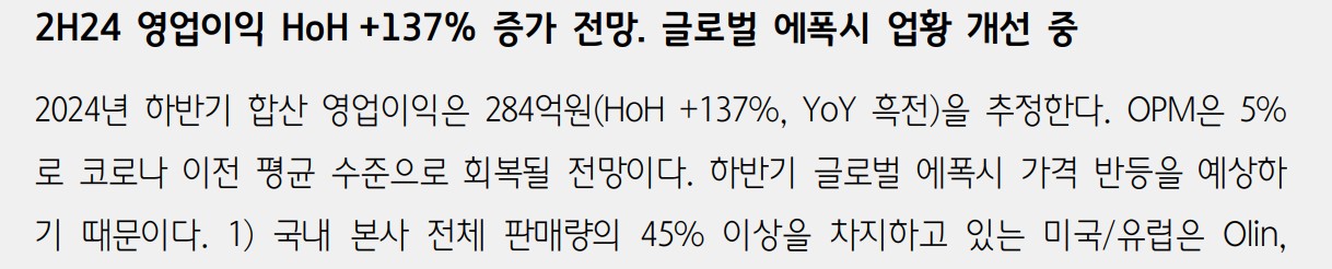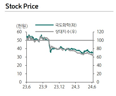 국도화학의 최근 수주상황 긍정적. 인도 법인의 판매량 증가, 인도 내 경쟁사들의 원재료 조달 문제로 발생한 물량 공백 메우면서 이루어짐. 인도의 적자폭 대폭 축소 전망. 중국 법인은 부동산 경기 부양책 효과로 내수 가격 소폭 반등. 글로벌 에폭시 업황 개선으로 긍정적 영향. 미국과 유럽 시장에서 6월부터 판가 인상 시작, 전반적인 수익성 향상 기대. 인도의 주택 건설과 인프라 확대, 에폭시 수요 크게 증가.
