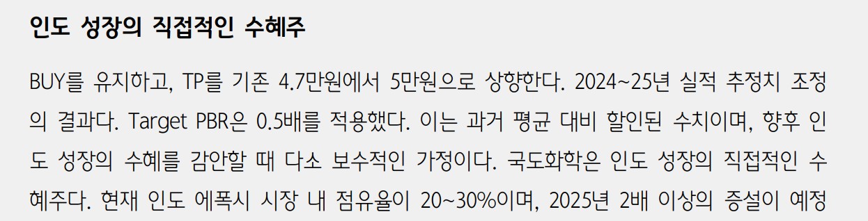 국도화학 목표주가 50,000원으로 상향 조정. 인도 시장 성장과 글로벌 에폭시 업황 개선 반영. 현재 주가 34,900원, 목표주가 대비 상승 여력 충분.