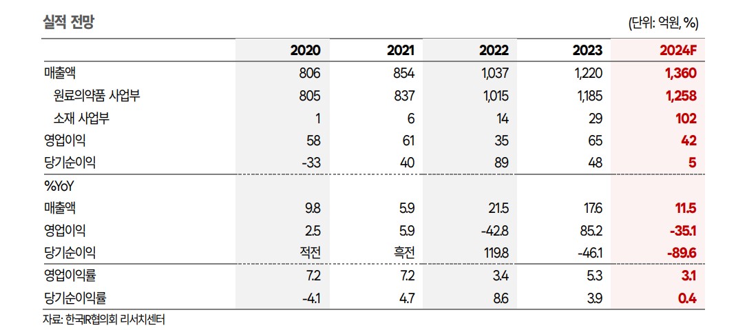 - 2023년 원료의약품 사업부 매출액: 1,191억원