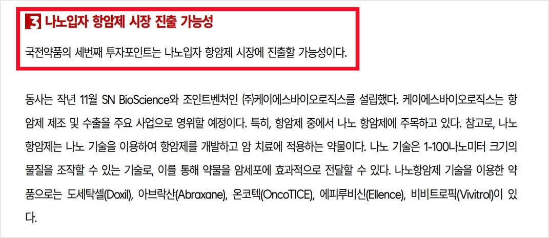 최근 국전약품은 나노입자 항암제 시장 진출을 위해 SN BioScience와의 조인트벤처를 설립했습니다. 이로 인해 나노 항암제 제조 및 수출을 준비 중이며, 첫 제품으로는 아브락산 제네릭 SNA-001을 개발 중입니다. 또한, OLED 소재의 상용화와 반도체 소재의 연구개발이 활발히 진행되고 있습니다.