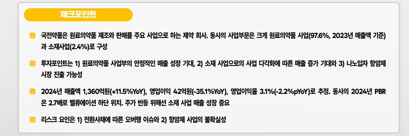 국전약품은 원료의약품과 소재 사업의 두 축을 기반으로 안정적인 매출 성장을 이어가고 있으며, 나노입자 항암제 시장 진출로 추가적인 성장 동력을 확보하고 있습니다. 향후 사업 다각화와 신제품 출시가 주가 상승의 주요 요인으로 작용할 것으로 보입니다.