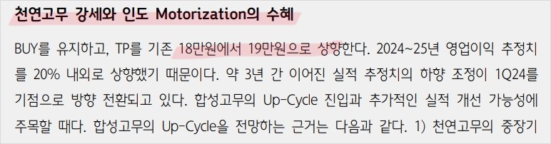 금호석유의 주가는 천연고무 강세와 인도 Motorization 수혜로 인해 상승할 것으로 예상됩니다. 현재 주가는 145,000원으로 목표주가 190,000원까지 상승 여력이 충분합니다. 합성고무의 Up-Cycle 진입과 실적 개선 가능성을 주목해야 합니다.
