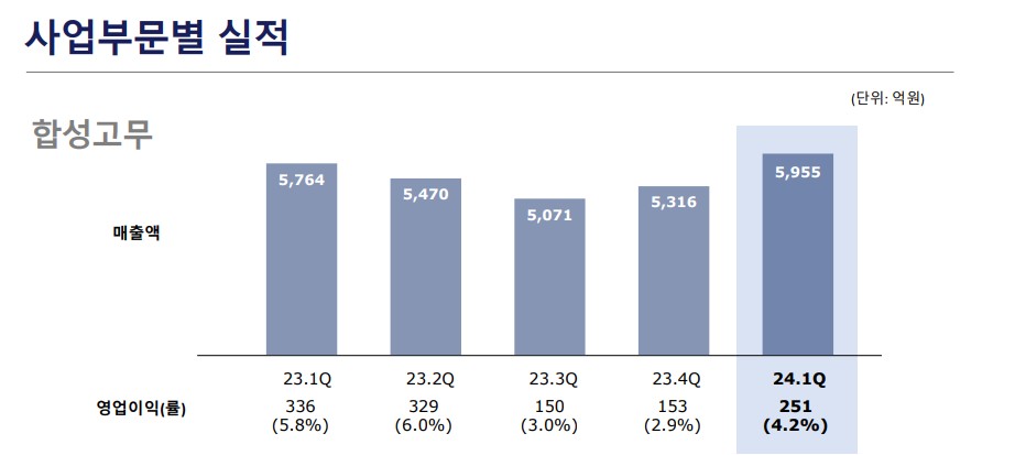 금호석유는 최근 천연고무 강세와 합성고무 수요 증가로 인해 실적 개선이 기대되고 있습니다. 2Q24 영업이익은 1,048억원으로 컨센서스를 상회할 것으로 보이며, 이는 전 사업부의 실적 개선 덕분입니다. 특히, 합성고무 부문에서의 강세가 두드러지고 있으며, NBL, SBR/BR, SSBR, NBR 모두 실적이 크게 개선되고 있습니다. 또한, 페놀 사업부와 합성수지 부문도 흑자전환이 예상됩니다.