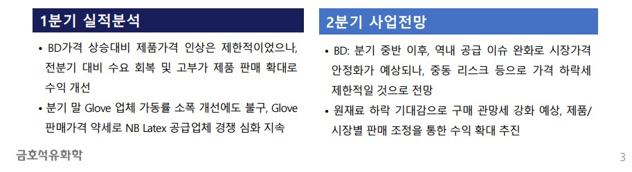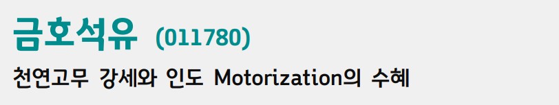 금호석유는 합성고무와 합성수지 분야에서 기술력과 시장 지배력을 갖춘 기업입니다. 특히, 천연고무 강세와 인도의 Motorization 수혜를 통해 향후 몇 년간 안정적인 성장이 기대됩니다. 재무 상태 역시 매출액과 영업이익의 큰 폭 상승이 예상되어 긍정적입니다.