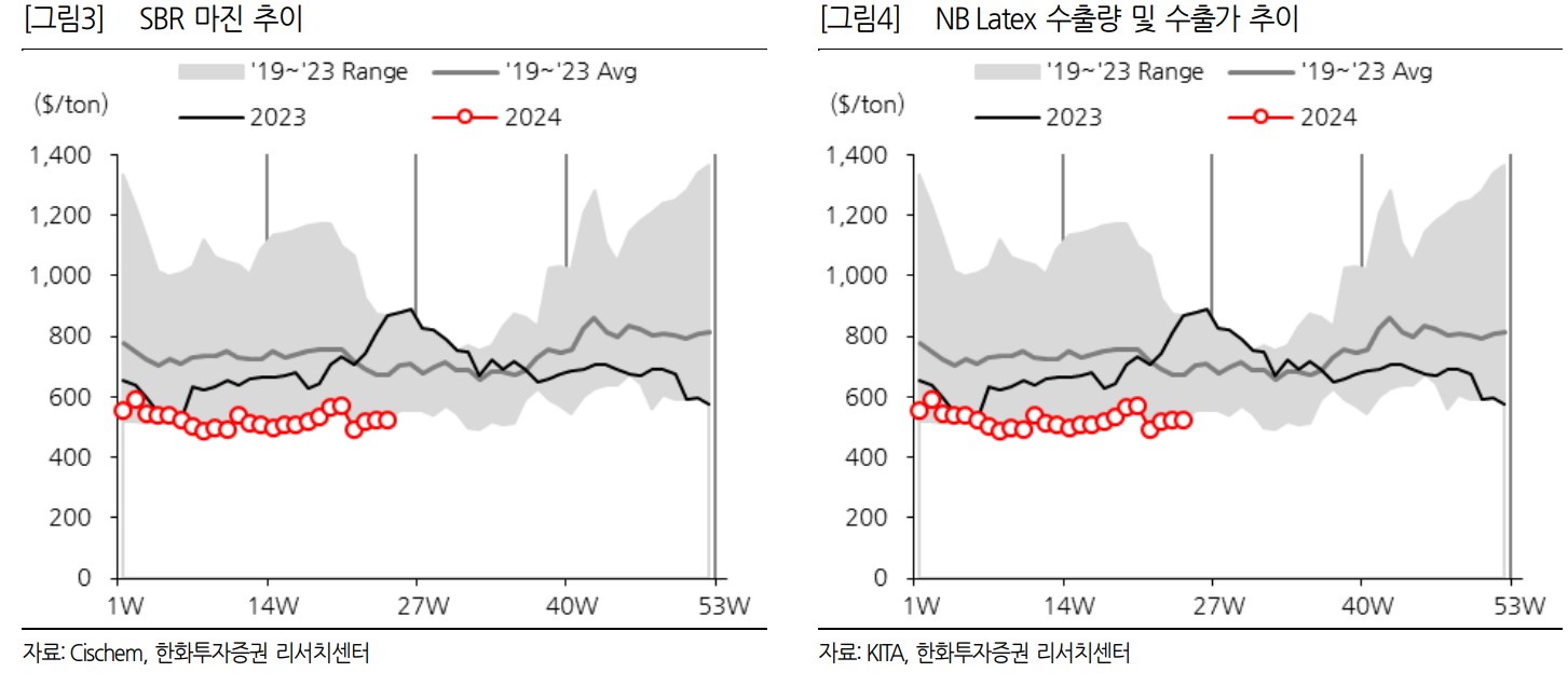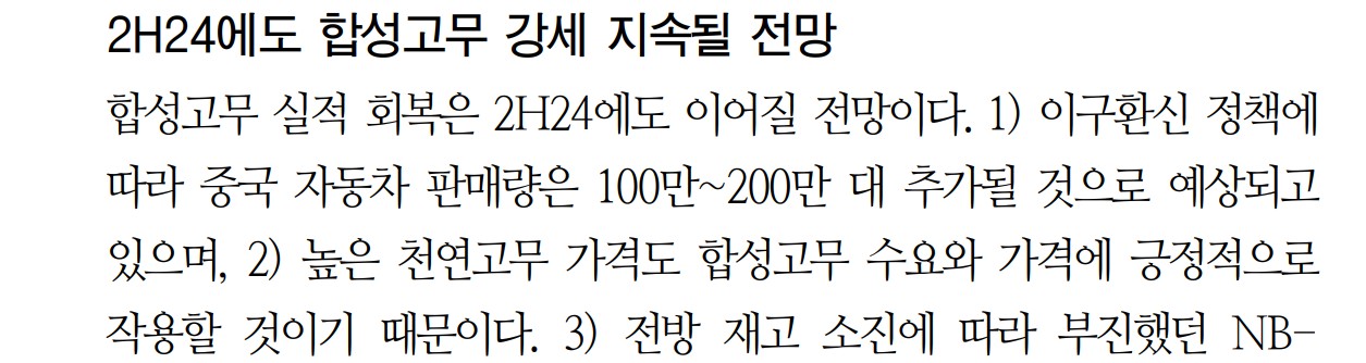 금호석유는 최근 합성고무와 합성수지 부문에서 강한 성과를 내고 있음. 2H24에도 합성고무 실적 회복이 지속될 전망이며, 중국 자동차 판매량 증가와 천연고무 가격 상승이 긍정적인 요인으로 작용할 것임. 전방 재고 소진에 따라 NB-Latex 수출량과 판가 회복도 지속될 전망임. BD 가격 상승에도 불구하고 원가 전가에 무리가 없다고 판단됨. 이는 합성고무 수요가 견조함을 방증함.
