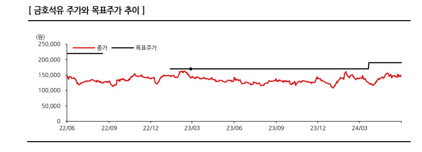 금호석유의 목표주가는 190,000원으로 제시됨. 이는 합성고무와 합성수지 부문의 성장을 반영한 것으로, 향후 주가 상승의 주요 요인이 될 것임. 금호석유는 지속적인 혁신과 글로벌 시장에서의 경쟁력 강화를 통해 주가 상승을 견인할 것으로 예상됨.