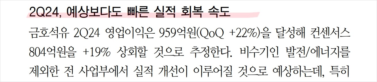 금호석유는 최근 합성고무와 합성수지 분야에서 두드러진 성과를 보이고 있음. 특히, 2Q24 영업이익은 959억원으로, 전 분기 대비 22% 증가하며 컨센서스를 상회함. 타이어 수요 회복과 NB-Latex 판가 및 판매량 개선이 주요 원인으로 작용함. 또한 ABS와 Epoxy 마진 개선에 따른 수지/페놀 사업부 흑자전환도 이익 개선에 기여함. 금호석유는 이러한 성과를 바탕으로 2024년에도 견고한 성장세를 이어갈 것으로 기대됨.