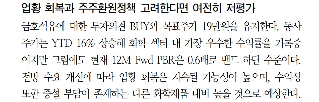 금호석유는 화학산업의 주요 기업으로, 합성고무, 합성수지, 페놀, EPDM 등을 생산하고 있음. 최근 실적 회복과 주주환원정책 등을 고려할 때 여전히 저평가된 상태임. 금호석유의 주가는 업황 회복과 함께 꾸준한 성장을 이어갈 것으로 예상됨. 모든 투자책임은 본인에게 있으며, 철저한 분석과 검토 후 투자 결정을 해야 함.