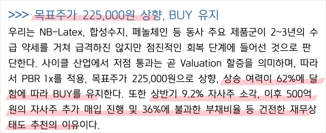 금호석유의 주가는 향후 긍정적인 흐름이 예상됨. 주요 제품군의 수요 회복과 자사주 매입/소각 계획이 주가 상승에 기여할 것으로 보임. 목표주가는 225,000원으로 설정됨.