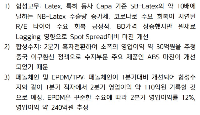 금호석유는 안정적인 재무구조와 자사주 매입/소각을 통한 주주환원정책을 이어가고 있음. 주요 제품군인 NB-Latex, 합성수지, 페놀체인 등이 점진적으로 회복 중이며, 이는 향후 주가 상승의 긍정적인 요소로 작용할 것임.