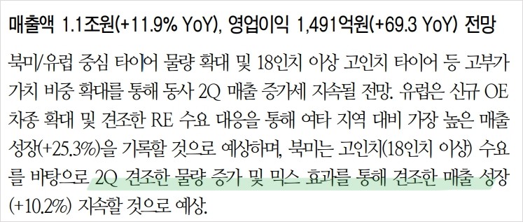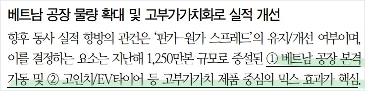 - EV 타이어와 고인치 타이어 비중이 점진적으로 높아지고 있으며, 이는 실적 개선에 긍정적인 영향을 미칠 전망.