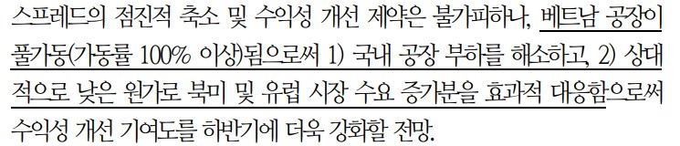 - 베트남 공장은 상대적으로 낮은 원가를 바탕으로 북미 및 유럽 시장 수요 증가분을 효과적으로 대응하고 있음.