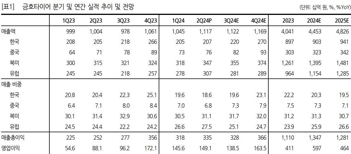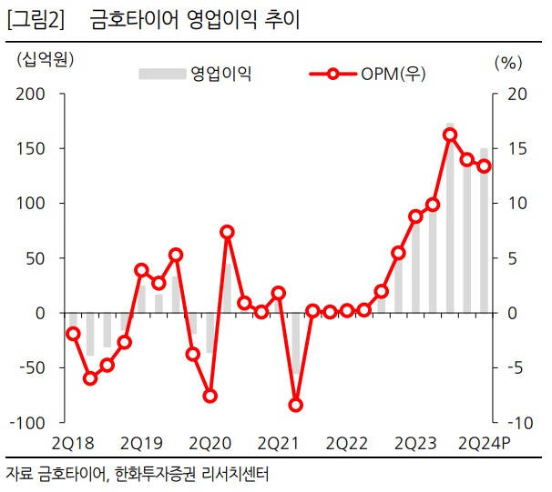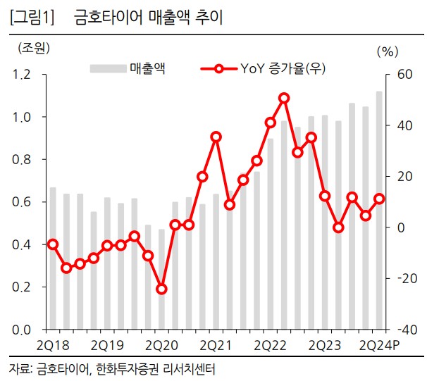금호타이어는 2024년 2분기 매출액 1.1조원(+11.9% YoY), 영업이익 1,491억원(+69.3% YoY)을 기록하며 성장세를 이어가고 있음. 북미와 유럽 시장을 중심으로 고인치 타이어 수요가 증가하고 있으며, 특히 유럽 시장에서의 매출 성장세가 두드러짐. 유럽은 신규 OE 차종 확대 및 견조한 RE 수요에 힘입어 높은 매출 성장을 기록 중임. 반면, 원자재 가격 상승과 해상운임 증가 등의 요인은 수익성 개선에 제약 요인으로 작용하고 있음. 하지만, 베트남 공장의 풀가동을 통해 원가 상승분을 상쇄하며 영업이익률 개선에 기여하고 있음.