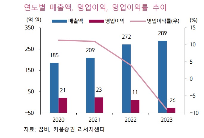 꿈비의 재무상황은 안정적임. 2023년 매출액은 289억 원, 영업이익은 -26억 원을 기록하였으며, 2024년 매출액은 360억 원, 영업이익은 8억 원으로 예상됨. 매출액과 영업이익 모두 꾸준히 증가하고 있어, 재무 안정성은 높은 편.