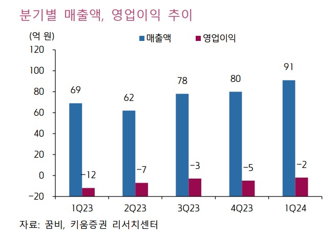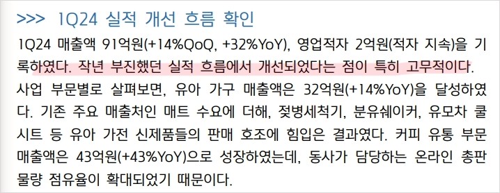 꿈비는 2024년 1분기 매출이 전년 대비 32% 증가하며 실적 개선이 기대됨. 특히, 유아용 가전 신제품들의 판매 호조와 커피 유통 부문 매출 증가가 주효함. 커피 유통 부문은 베트남 G7 커피의 국내 온라인 유통을 담당하고 있으며, 온라인 총판 물량 점유율이 확대되고 있음.