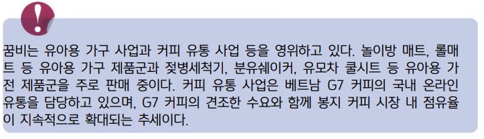 꿈비는 유아용 가구 및 가전 제품의 판매를 주력으로 하는 기업으로, 2024년 1분기 매출액 91억 원을 기록하며 전년 대비 32% 증가함. 특히, 커피 유통 부문에서의 성장이 돋보이며, 베트남 G7 커피의 국내 온라인 유통을 통해 매출 확대가 기대됨.