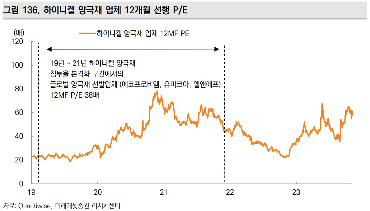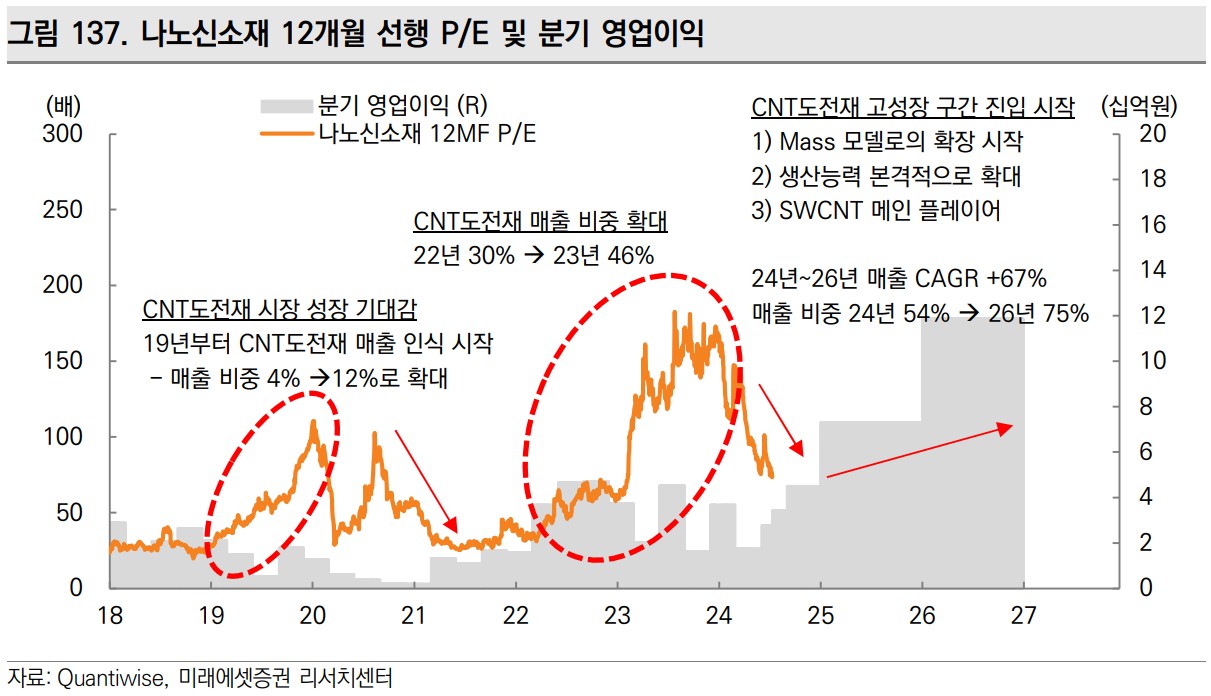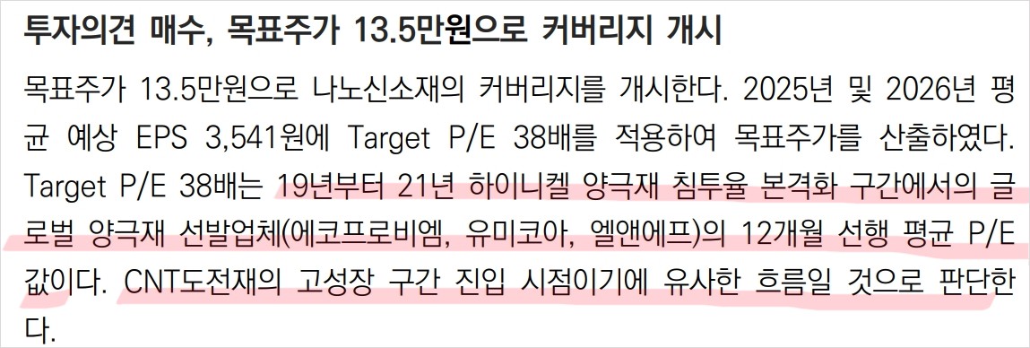 나노신소재는 2차전지 소재 시장에서 독보적인 기술력을 보유하고 있음. 최근 2025년 목표주가를 135,000원으로 상향 조정함. 이는 평균 EPS 3,541원에 Target P/E 38배를 적용한 결과임. 나노신소재는 특히 CNT도전재에서 높은 성장 가능성을 보여주고 있으며, 향후 매출 비중이 증가할 것으로 전망됨.