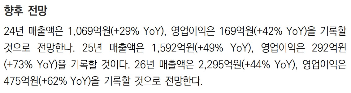 - 2024년 예상 매출액: 1,069억원 (+29% YoY)