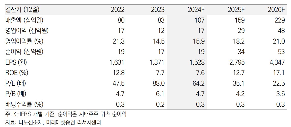 나노신소재의 재무 상황은 비교적 안정적임. 2024년 매출액은 1,069억원으로 예상되며, 영업이익은 169억원으로 전망됨. 부채비율은 200% 기준으로 양호한 수준을 유지하고 있음. 나노신소재의 주요 지표는 아래 표와 같음.