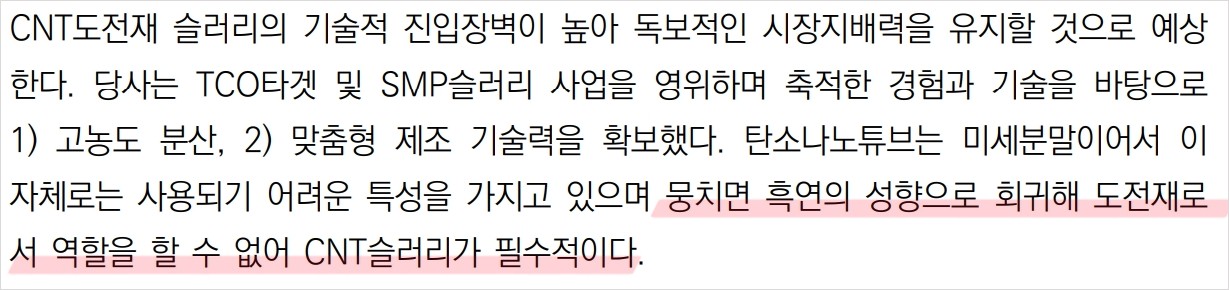 - 기술적 분석: 나노신소재는 CNT도전재에서 고농도 분산 기술력을 확보하고 있음.