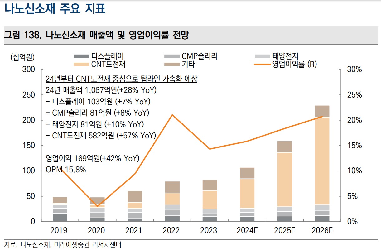 나노신소재는 2차전지 소재 시장에서 독보적인 기술력과 확장된 생산능력으로 주목받고 있음. CNT도전재의 고성장 구간 진입과 글로벌 시장 확장은 주가 상승의 주요 요인으로 작용할 것임. 따라서, 나노신소재는 향후에도 지속적인 성장이 기대되는 기업으로 평가됨.