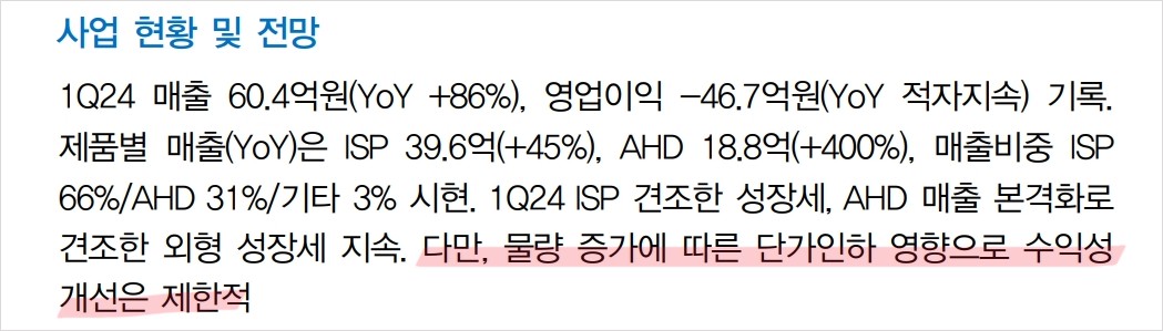 넥스트칩은 차량용 지능형 카메라 영상처리 및 인식용 시스템 반도체 전문 개발 기업임. 최근 영업실적은 1Q24 매출 60.4억원, 영업이익 -46.7억원을 기록했음. 제품별 매출은 ISP 39.6억원, AHD 18.8억원임. 주요 제품은 ISP와 AHD로 구성되어 있음. 신사업인 ADAS SoC 수주도 기대됨.