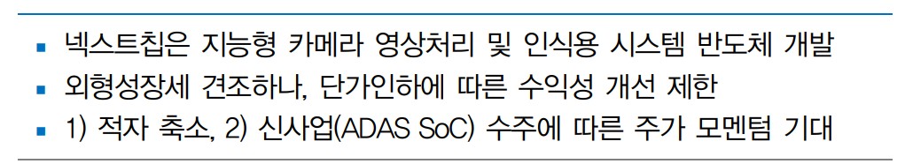 넥스트칩은 차량용 지능형 카메라 영상처리 및 인식용 시스템 반도체 전문 개발 기업으로서, 기술적 분석과 기본적 분석에서 성장 가능성이 높음. 신사업인 ADAS SoC 수주 성과에 따라 주가 모멘텀도 기대됨.