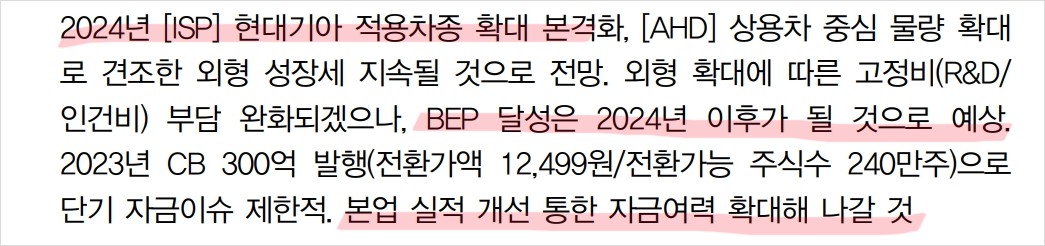넥스트칩은 최근 유럽 OEM과 ADAS SoC 관련 아파치5/6 탑재 논의 및 기술 테스트를 진행 중임. 이로 인해 2024년 말 또는 2025년 매출 인식이 기대됨. 또한 현대기아 적용차종 확대 본격화로 매출 증가 기대. CB 300억 발행으로 단기 자금이슈는 제한적임.