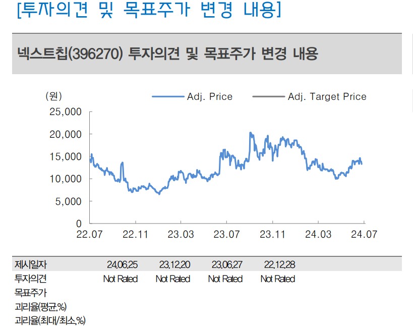 넥스트칩의 목표주가는 20,000원으로 설정됨. 이는 신사업 성과와 기존 사업의 안정적인 성장세를 반영한 수치임.