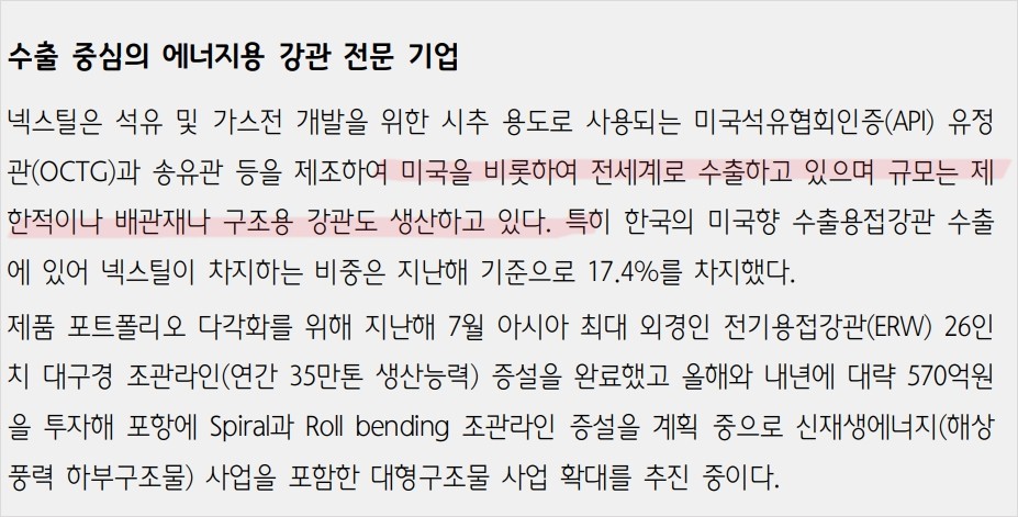 넥스틸은 수출 중심의 에너지용 강관 전문 기업으로, 미국석유협회 인증(API)을 받은 유정관(OCTG)과 송유관을 제조하여 전세계로 수출하고 있습니다. 특히 한국의 미국향 수출용접강관 수출에 있어 중요한 비중을 차지하고 있습니다. 최근 대구경 조관라인 증설을 통해 생산능력을 확대하였으며, 신재생에너지 사업에도 진출을 계획 중입니다.