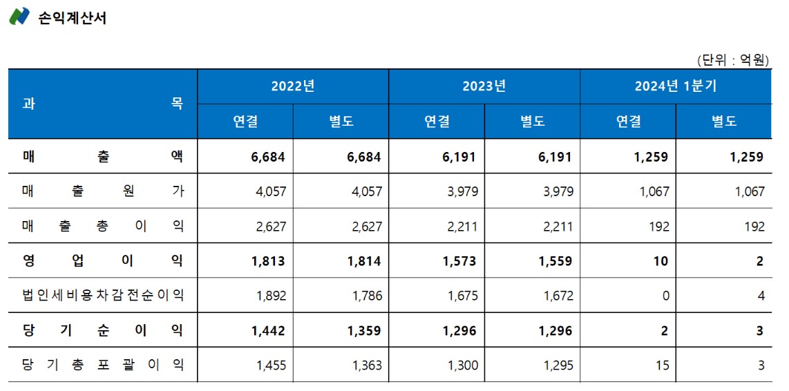 | 단위(원) | 2021년 | 2022년 | 2023년 | 2024년 1분기 |