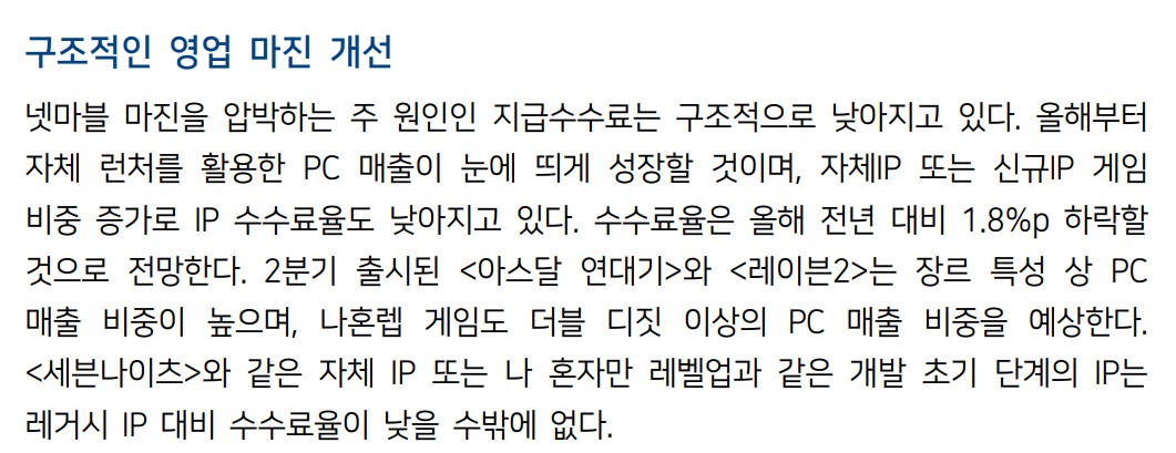 넷마블의 최근 주요 이슈는 '나 혼자만 레벨업: ARISE'의 성공적인 출시이다. 해당 게임은 출시 하루 만에 27개국 모바일 매출 순위 상위 10위 권에 진입하며, DAU(일일 활성 사용자 수) 500만 명 이상, 일 매출 140억 원 이상을 기록했다. 센서타워는 한 달 간 누적 매출을 1,000억 원으로 추정하고 있으며, 이는 PC 매출이 누락된 값으로 실제 매출은 이를 상회할 것으로 예상된다. 매출은 콘텐츠 고갈에 따라 3분기에는 하락할 것으로 예상되나, 4분기에는 애니메이션 2기 방영과 스팀 출시로 반등할 것으로 보인다. 또한, 2분기 출시된 '아스달 연대기'와 '레이븐2'는 PC 매출 비중이 높아 영업 마진 개선에 기여할 것이다. 인력 효율화의 효과는 올해 온기 반영될 것으로 예상되며, 보수적인 인력 관리 기조를 이어갈 것이다.