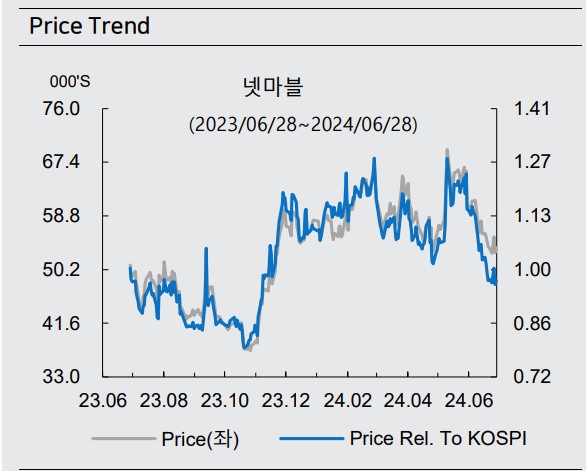넷마블은 2024년 2분기에 역대 최대 영업이익을 기록할 것으로 예상되며, 이는 주가에 긍정적인 영향을 미칠 것으로 보인다. '나 혼자만 레벨업: ARISE'의 성공적인 출시와 함께 인건비 및 지급수수료율의 감소가 주요 원인으로 작용하고 있다. 넷마블의 구조적인 영업 마진 개선은 장기적인 관점에서 기업의 성장 가능성을 높여줄 것이다. 따라서, 넷마블의 주가는 2024년에도 상승할 가능성이 높으며, 목표주가는 75,000원으로 제시되었다.