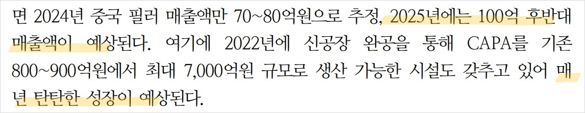 A. 중국 시장 진출과 신공장 완공으로 인한 생산능력 확대가 주요 성장동력임.