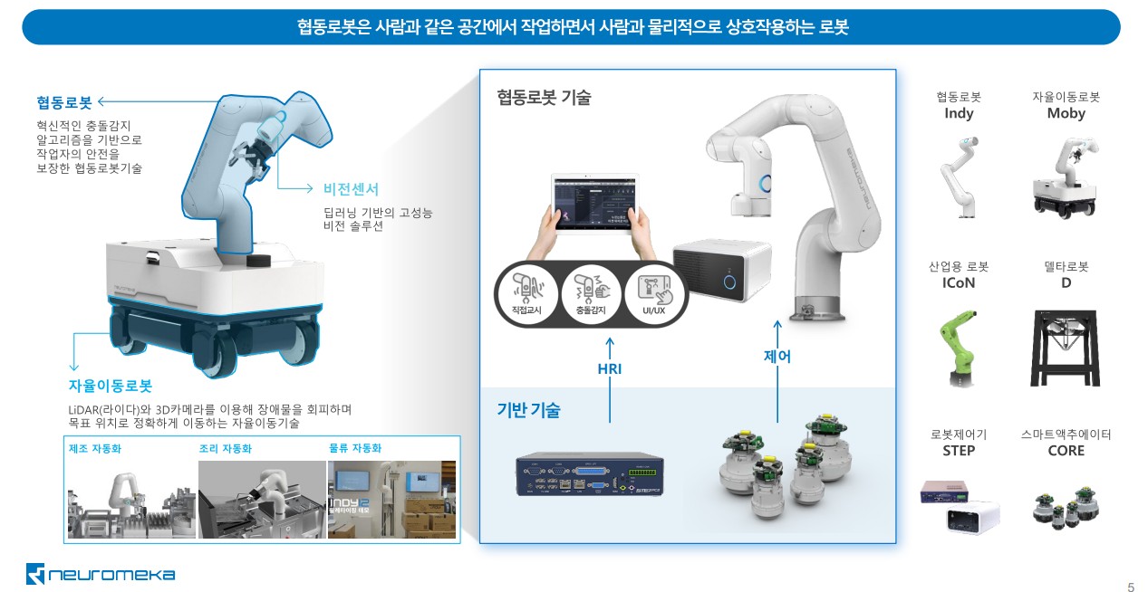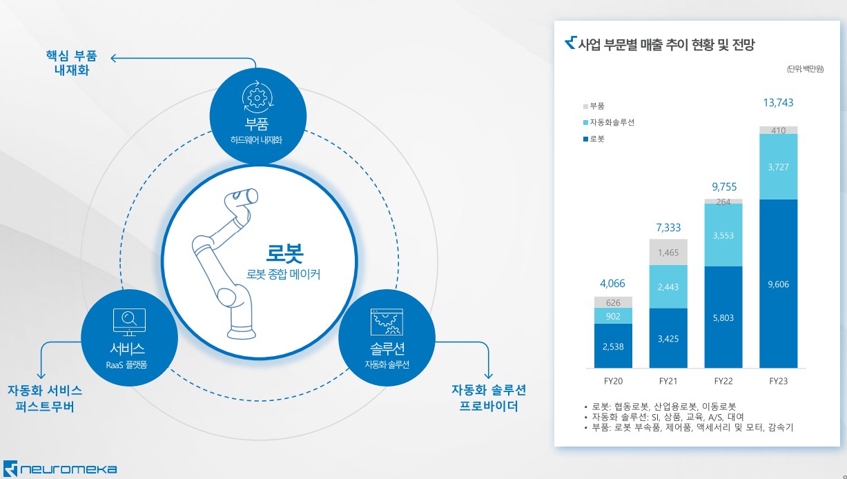 뉴로메카는 최근 다양한 로봇 솔루션을 선보이며 시장에서 주목받고 있습니다. 2024년 2월에는 해군 함정 선체 정비용 로봇을 납품했으며, 2023년 3월에는 신개념 용접 솔루션을 공개했습니다. 이러한 제품들은 국내외 조선사와의 협의를 통해 공급이 확대될 예정입니다. 또한, 튀김로봇 시스템을 개발하여 국내 대표 프랜차이즈 교촌치킨과의 협력을 통해 매장 내 도입을 확대하고 있습니다. 이러한 다양한 산업에서의 로봇 솔루션 제공은 뉴로메카의 매출 성장을 이끌 주요 요인입니다.