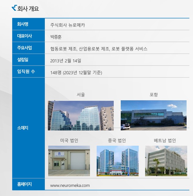 뉴로메카는 협동로봇 제조를 기반으로 영역을 확장하고 있는 기업입니다. 2024년에는 의료로봇, 용접로봇, 튀김로봇 등의 신규 매출을 기반으로 한 실적 성장이 기대됩니다. 뉴로메카의 경쟁력은 로봇 제조를 위한 수직적 밸류체인 구축, 다양한 로봇 제품 라인업 확보, 그리고 다양한 전방산업을 보유한 것에서 나옵니다. 특히, 모터와 감속기 등 협동로봇의 핵심 부품들의 내재화가 구축되고 있어 안정적인 제조 및 이익률 개선이 기대됩니다.