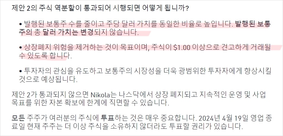 니콜라가 상장폐지를 막기 위해 다음 주주총회에서 액면병합 투표를 진행합니다. 액면병합을 하게 되면 5월 13일 기준으로 0.5달러였던 주가가 1달러로 상승하며 주식 수는 절반으로 줄어들죠. 결과적으로 주가가 1달러 이상 넘게 되면서 상장폐지는 막을 수 있습니다.