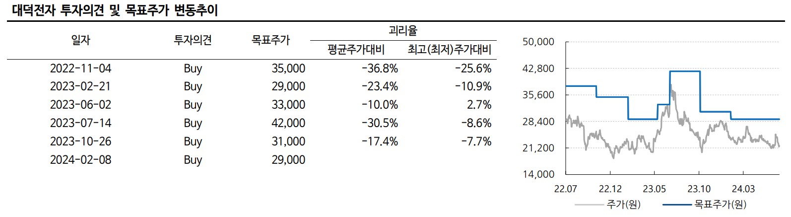 대덕전자의 목표주가는 29,000원으로 제시되고 있음. 이는 현재 주가 대비 33% 상승 여력이 있음을 나타냄. 회사의 재무 개선과 신규 사업 확장은 이 목표가 달성될 가능성을 높여줌. 개인적인 의견으로는, 대덕전자는 현재 시장에서 undervalued 되어 있으며, 장기적인 투자 가치가 있다고 판단됨.